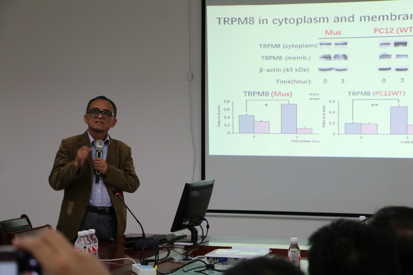 杜力军教授以“冷应激对肿瘤敏感受体TRPM8的调控”为题,首先对肿瘤细胞TRPM8的功能以及冷应激对于该受体的负调控过程做了详细介绍,重点讲解了冷敏感通道对于肿瘤的作用特点,并与现场师生进行了充分的交流。杜力军教授的讲座内容生动形象,使参会师生获益匪浅。