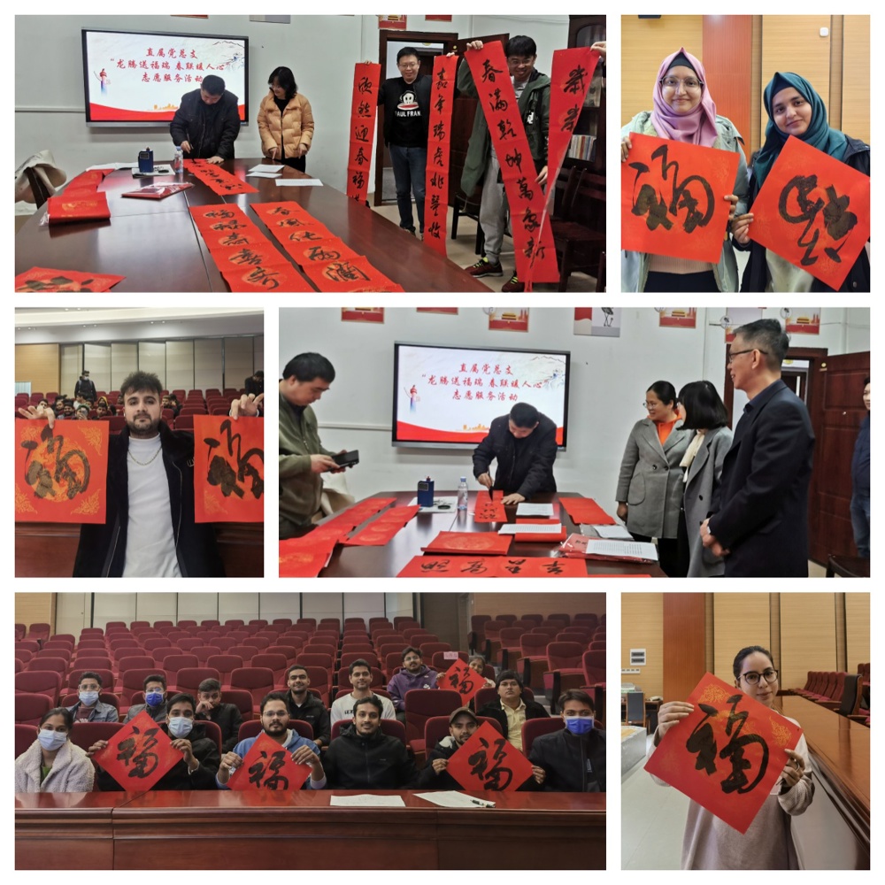 2024年1月11日,直属党总支在党员活动室开展了一场温馨而意义非凡的“龙腾送福瑞 春联暖人心”公益送春联志愿服务活动。此次活动不仅大力弘扬了中华传统文化,增进了校园文化氛围,更是一次跨越国界的文化交流。