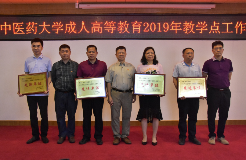 为表彰先进,树立模范,副院长覃振林宣读表彰招生与教学优秀先进单位的决定,成教院领导班子对荣获2018年度先进单位的4个教学点颁发牌匾。
