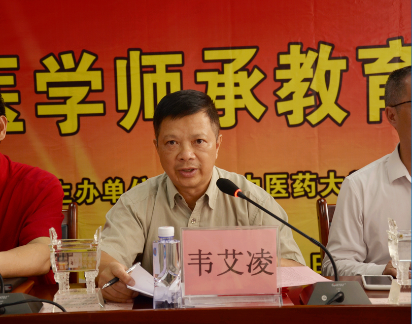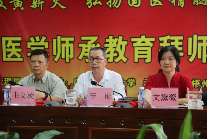 拜师仪式前的会议由黄瑞诚副院长主持。李论代表梧州市中医药管理局向与会的指导老师和师承人员表示热烈的祝贺。他指出,此次在梧州中医医院开展传统医学师承教育是梧州市中医药发展的重要举措,是发展梧州中医药人才的好机会。希望各位老师能对学生严格要求,也殷切期望各位学员能虚心求教、开拓创新,做优秀的中医传承人。韦艾凌指出:中医学是一门实践性很强的科学,以经验医学著称,没有广泛的临床、没有名师的指点,很难体会到个中的深奥微妙。希望学员们要尊敬老师,勤奋学习,善于思考,只有这样,才能融汇贯通,成为一名合格的、优秀的中医人才。