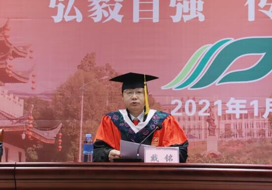 戴铭在致辞中对顺利完成学业的全体毕业生表示热烈祝贺,对即将踏上新征程的同学们提出了三点希望:一是站在新时代,勇挑重任;二是服务大健康,学无止境。希望同学们保持一颗求知若渴之心,不断学习,服务大健康产业;三是常怀感恩心,珍爱自信。希望同学们感恩母校,感恩家人和朋友,正是由于学校的培养教育、父母的关爱、爱人的支持,你们才能在繁重的工作之余继续学习深造。最后,戴铭语重心长地嘱咐同学们,无论今后走到哪里,都要牢记自己的使命和担当,筚路蓝缕、砥砺前行。