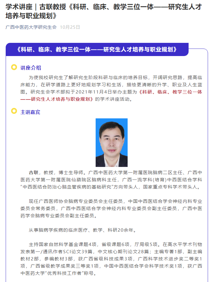 学术讲座《科研、临床、教学三位一体——研究生人才培养与职业规划》
