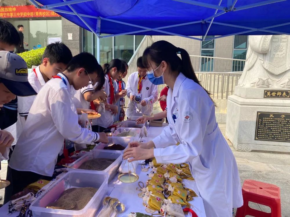 为深入贯彻落实党的二十大精神,促进中医药壮瑶医药传承创新发展,推动中医药文化贯穿国民教育,融入生产生活,向学生普及掌握中医药知识,启发学生做中华优秀传统文化的传承人,根据《自治区中医药局 自治区党委宣传部 自治区教育厅 自治区文化和旅游厅 自治区卫生健康委 自治区广电局关于印发<广西壮族自治区中医药壮瑶医药文化内涵提升工程实施方案(2021—2025年)>的通知》精神,由自治区中医药管理局主办,Beat365中国唯一官方网站第一附属医院、南宁市三中初中部(青秀校区)共同承办的壮族三月三·2023年广西中医药文化进校园品牌活动暨南宁市三中初中部(青秀校区)结对共建活动在2023年4月18日下午南宁市三中初中部成功举办。中医治未病中心团队做为活动主要参与者,开展了一场别开生面青少年中医药科普知识讲座和中药香囊制作DIY体验活动,在青少年朋友群中反响热烈。