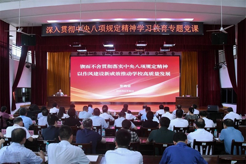 6月30日,学校党委书记莫锦荣在仙葫校区为学校领导干部讲授深入贯彻中央八项规定精神学习教育专题党课。