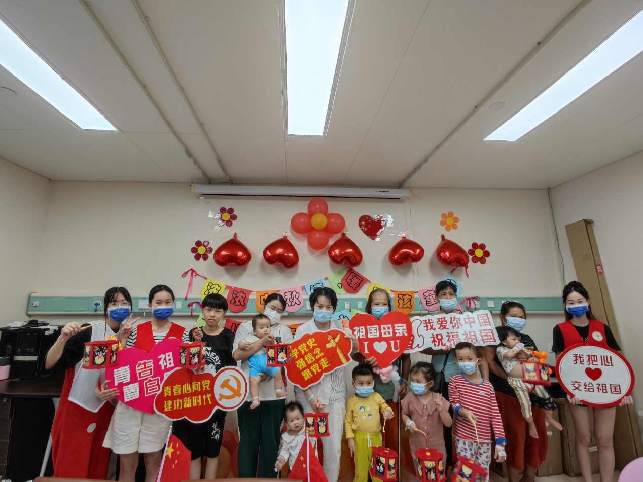 活动在欢快活泼的情景剧中展开,社工姐姐们带着可爱的玩偶服装,通过角色扮演生动地讲述中秋佳节的神话故事,孩子们聚精会神,认真倾听中华传统故事。随后,为寄托中秋祝福,社工、医护人员、家属陪伴孩子们共制灯笼,感受节日气氛,展现出科室人文关怀的浓浓氛围。活动最后,孩子们与社工、医护人员纷纷在中秋照相框下合影留念,并寄语祖国,向祖国母亲告白。