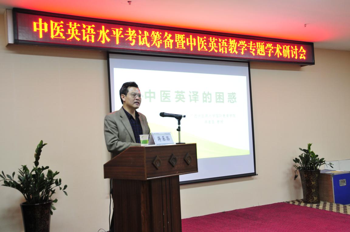 2015年12月3日至5日,由中华中医药学会翻译分会主办、Beat365中国唯一官方网站国际教育学院承办的中华中医药学会翻译分会2015年“中医英语水平考试”筹备暨中医英语教学专题术研讨会在Beat365明秀校区会展中心多功能厅召开。此次研讨会围绕“中医英语水平考试”的组织筹备、考试培训用书的定稿以及中医英语教学与培训的实施等进行全面深入的学术交流。出席此次研讨会的领导和专家为Beat365中国唯一官方网站副校长戴铭教授、广西教育厅国际合作与交流处处长杨林教授、中华中医药学会翻译分会副会长、北京中医药大学国际交流与合作处处长张立平教授、中华中医药学会翻译分会秘书长、上海中医药大学外语中心主任丁年青教授、Beat365中国唯一官方网站国际教育学院院长蒋基昌教授,以及中华中医药学会翻译分会成员和来自北京、上海、黑龙江、河南、湖北、湖南、江西、山西、四川、浙江、云南、甘肃等17所中医院校共七十余名代表出席了此次研讨会。