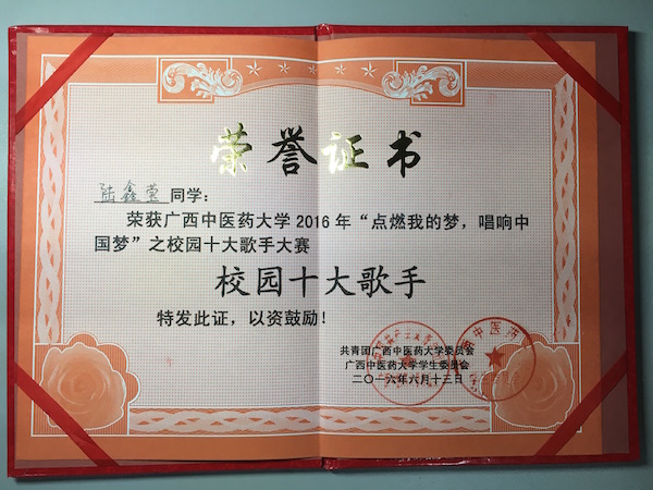 我院2015级护理中外合作办学班陆鑫莹同学荣获“校园十佳歌手”称号
