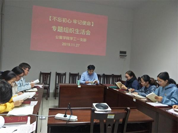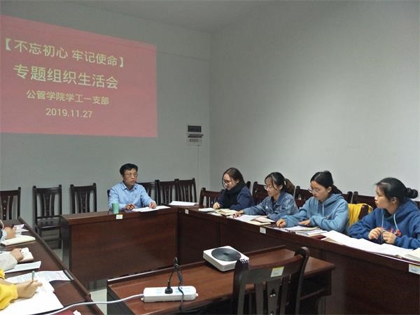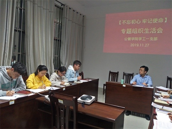 11月27日下21:30,院学工一支部在大学生活动中心A111开展“不忘初心、牢记使命”组织生活会,支部书记宋南以及一支部全体在校生党员参加了会议。会议由宋南主持。