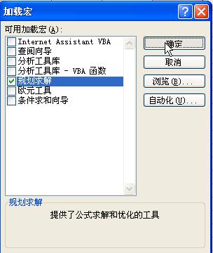 在弹出的对话框中的“可用加载宏”列表框中,选定待添加的加 载宏“规划求解”选项旁的复选框,然后单击“确定”。单击“确定”以后,“工具”菜单下就会出现一项“规划求解”。如果需要其他功能,也可以用鼠标勾选(加载的宏越多,excel 启动的时候就会越慢,所以请根据自己的需要选择)。