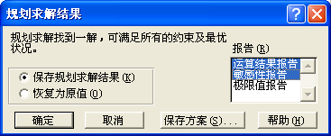 在选项按钮中可以选择求解线性规划和假定非负,点击求解按钮出现下图,选中报告后并保存求解结果: