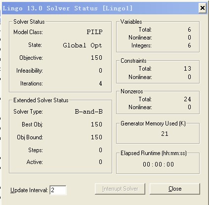 如果在编译阶段期间没有发现模型错误,LINDO将开始实际求解模型。当Lindo的内部求解器启动时,它将在屏幕上显示如下状态窗口(Status Window):
