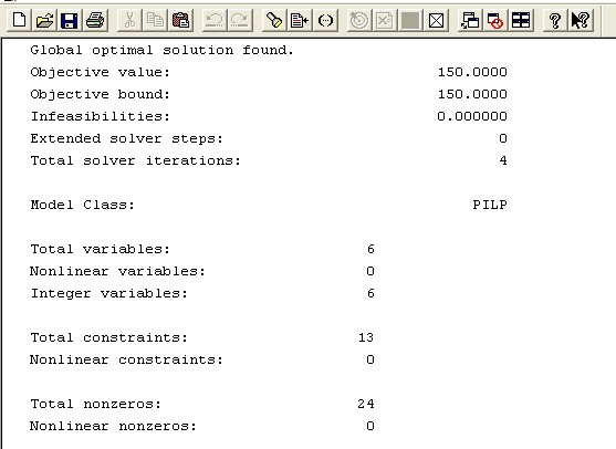 注意:(1)LINDO将“<”解释为“小于等于”而不是“严格小于”。可以输入“<=”替代“<”字符。