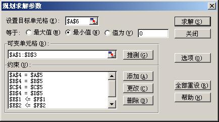 (2)单击“工具”菜单下的“规划求解”,在弹出的“规划求解参数”对话框中输入各项参数。