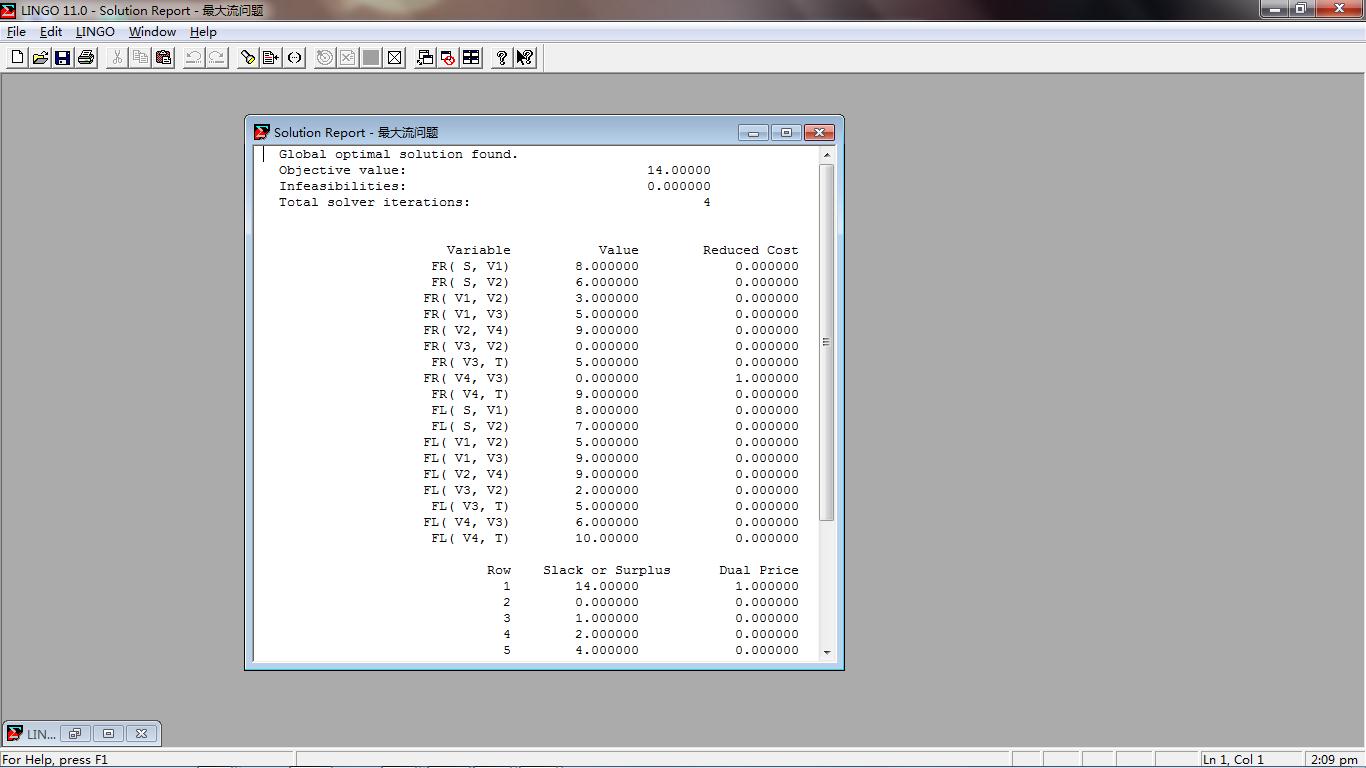 求解得到全局最优解,最大流为14,其中各个路径上的明细流量详见下图中的FR值。