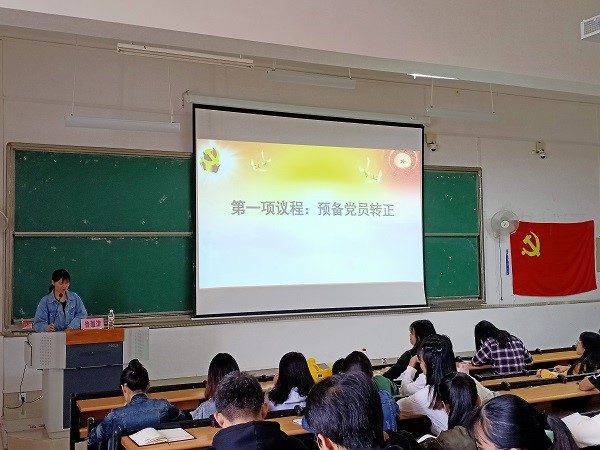 会议议程第一项,支部书记鲁蕴律带领全体党员合唱《国际歌》,经过预备党员汇报预备期表现、党小组介绍预备党员在预备期的表现情况和小组意见、支部委员会介绍预备党员在预备期的教育和考察情况、与会党员无记名投票表决、公开唱票等一系列规范流程,梁杏艳等17名预备党员全票通过表决,大会同意这17名预备党员按期转为中共正式党员。最后,由鲁蕴律带领大家宣读了入党誓词。