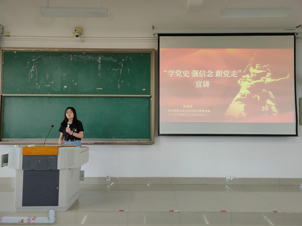 为了教育引导学生了解党的光辉历史、感悟党的初心使命,公共卫生与管理学院于2021年5月9日17:30在仙葫校区教学楼1-301教室召开了以“学党史、强信念、跟党走”为主题的党史宣讲会。会议由院学生工作办公室主任宋南主持,“十佳团支书”获得者李莹莹作为本次会议宣讲人。