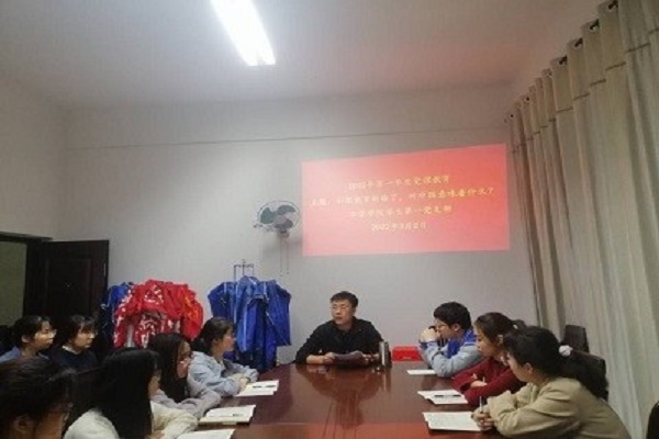 为加强党员思想建设,密切联系实事政治,院学生第一党支部于2022年3月8日17:30在大学生活动中心A112会议室开展2022年度第一季度党课教育,本次党课教育由支部书记宋南主讲,支部全体在校生成员参加。