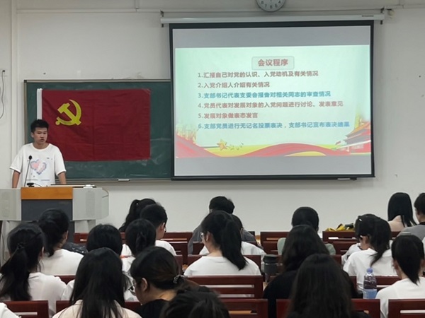 会上,唐梧茜向支部成员阐述了本次会议接收预备党员的程序,大会对23名同志逐一展开讨论。23名同志从对党的认识、入党动机、现实表现情况等方面依次向党组织作出汇报,并表明自己入党的决心;唐梧茜作为入党介绍人和支委会代表介绍了发展对象在考察期内的表现并报告了发展对象审查情况;与会党员充分讨论,发表入党意见;经过8名正式党员的无记名投票,一致同意接收明锐等23名同志为中共预备党员。