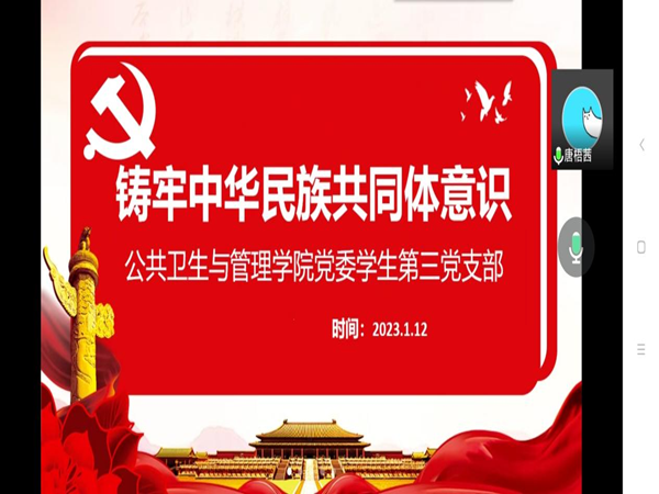 公共卫生与管理学院党委学生第三党支部于1月12日上午11:00通过腾讯会议开展1月主题党日活动——铸牢中华民族共同体意识。本次活动由支部书记唐梧茜主持,支部全体党员参加本次活动。