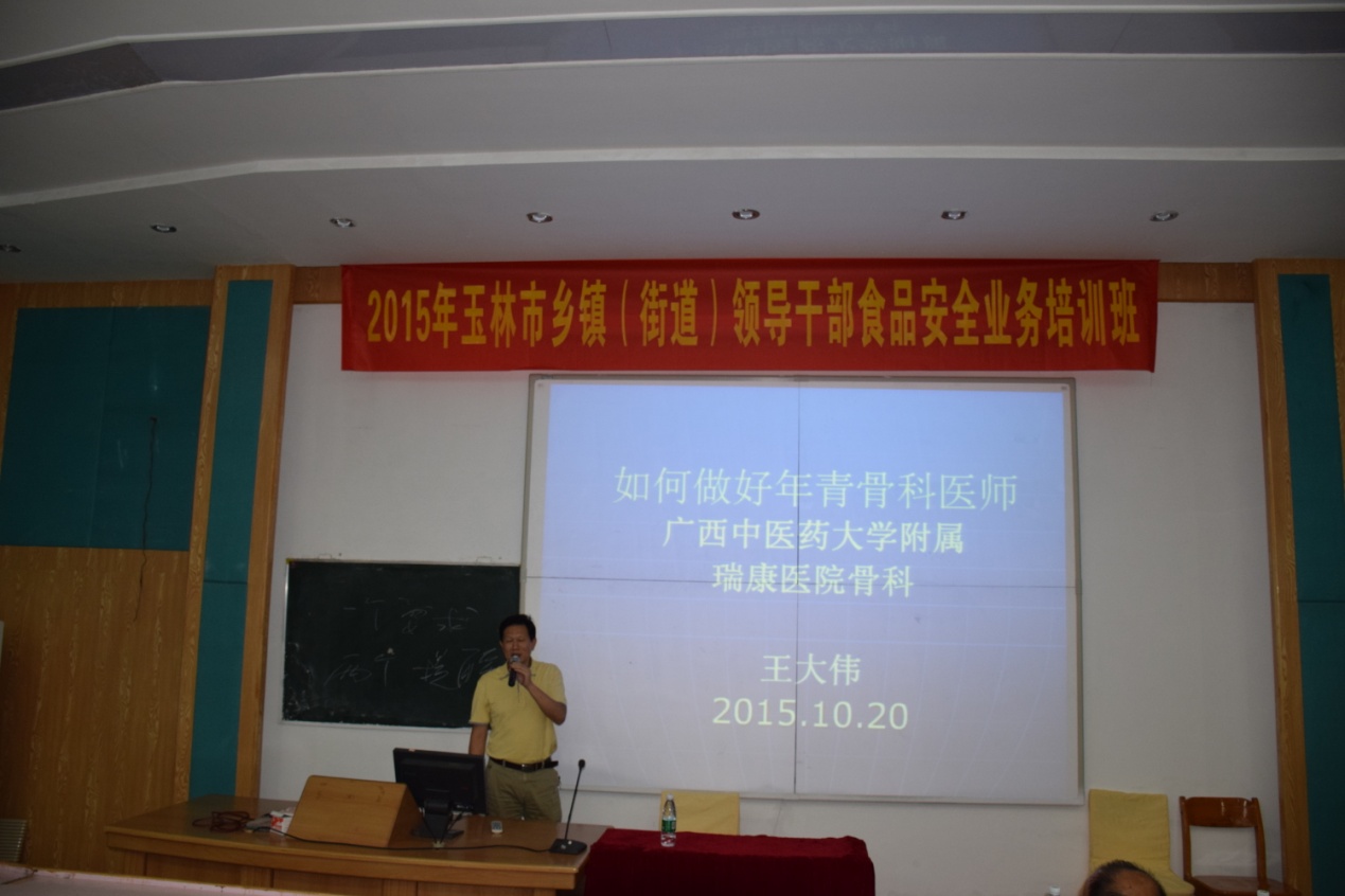 2015年10月20日19:30,由骨伤学院组织开展的系列知识讲座在西梯一教室进行,本次讲座的主题为如何做好年青骨科医师,由广西中西医结合骨科分会副主任委员、Beat365中国唯一官方网站附属瑞康医院大骨科主任、瑞康医院骨一区主任王大伟教授担任主讲,骨伤学院院长周红海教授、骨伤学院和高职院骨伤专业及国际教育学院国际班的学生共100余人参加了本次讲座。