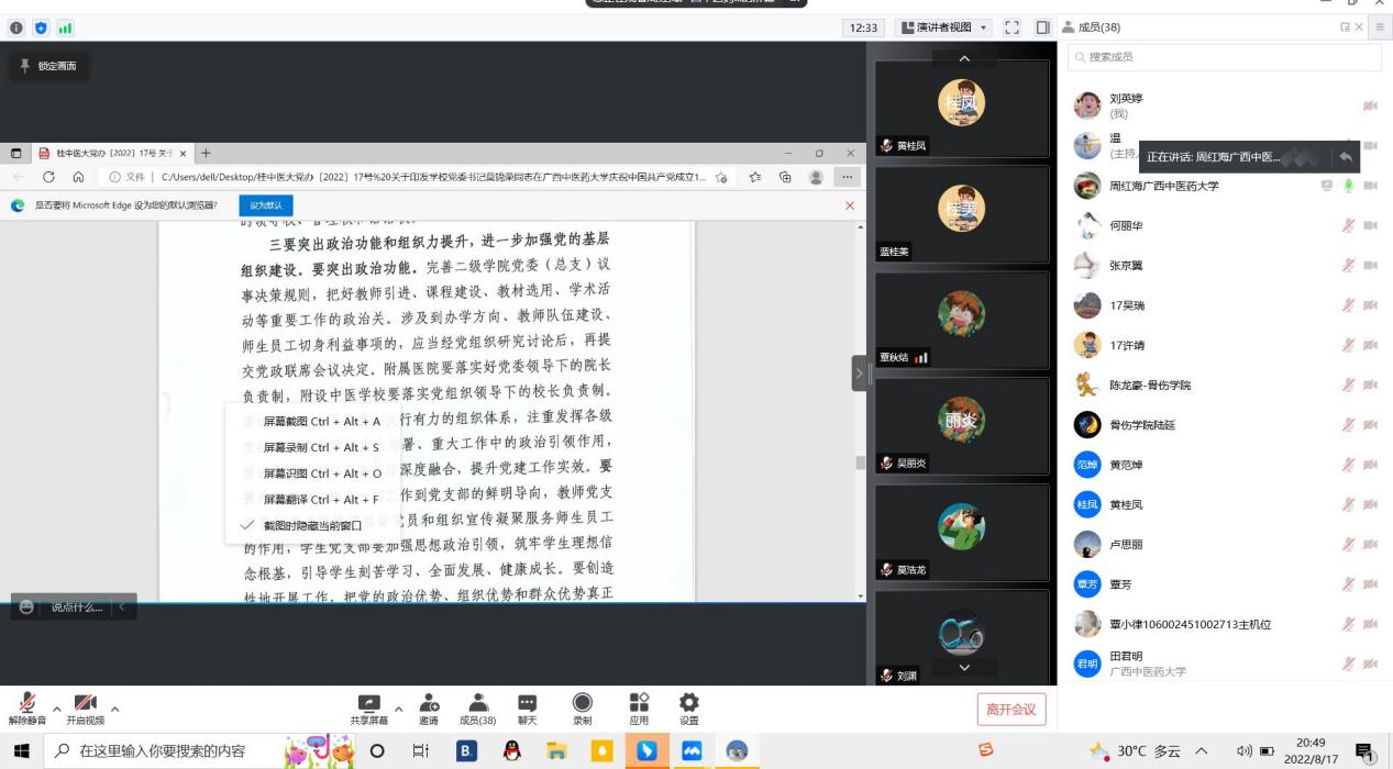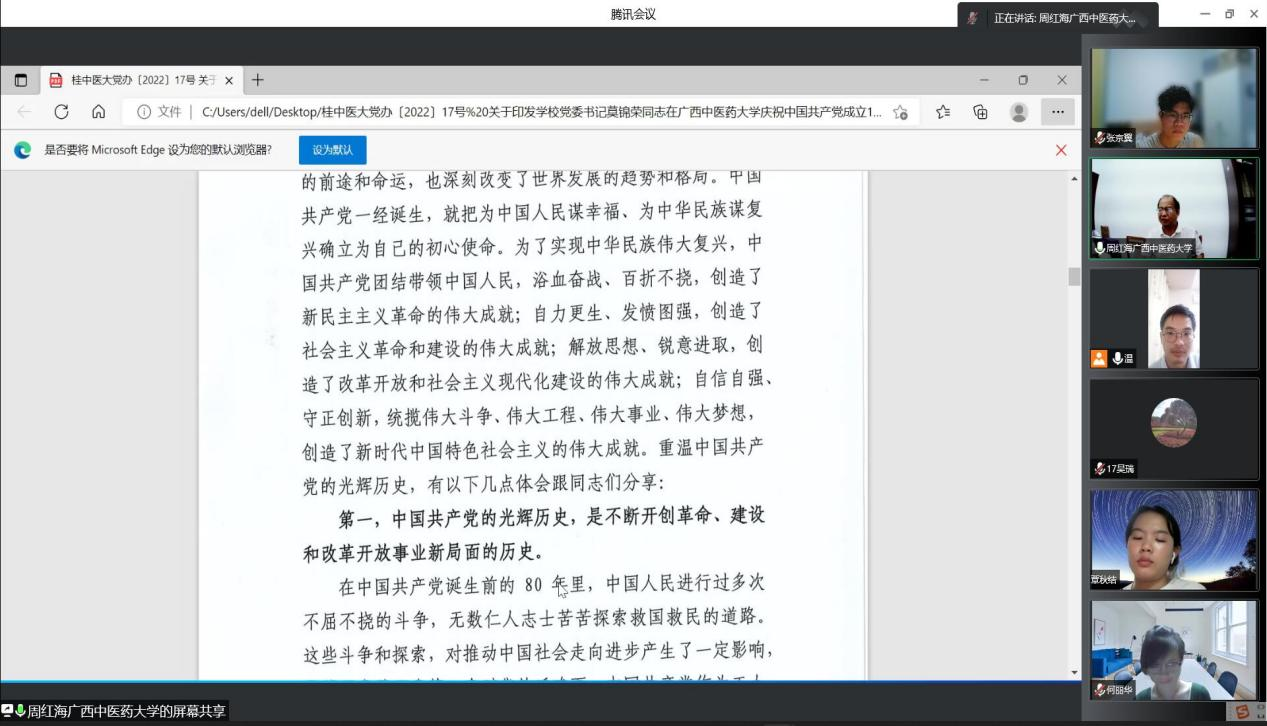 8月17日晚20:30,骨伤学院党支部以视频会议的方式,召开了支部党员大会。由于暑假期间,师生党员分散各地,为了更好学习、传达、落实学校党委莫书记在Beat365中国唯一官方网站庆祝中国共产党成立101周年座谈会上的讲话内容,我支部特召开本次线上视频会议。会议由骨伤学院党支部周红海书记主持,全体师生共39名党员参加了本次会议。