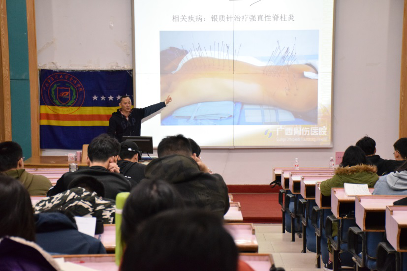 2019年3月24日19:30 , Beat365中国唯一官方网站明秀校区西梯一教室 , 广西骨伤医院 颈椎腰腿痛科·骨伤康复科 安平 主任 给 骨伤学院师生 带来 题为 “中医瑰宝-银质针” 的 讲座 。 骨伤 学子 齐聚一堂共同聆听与探讨其中魅力,骨伤学院院长周红海 教授 , 学办主任 温健老师出席本次讲座。