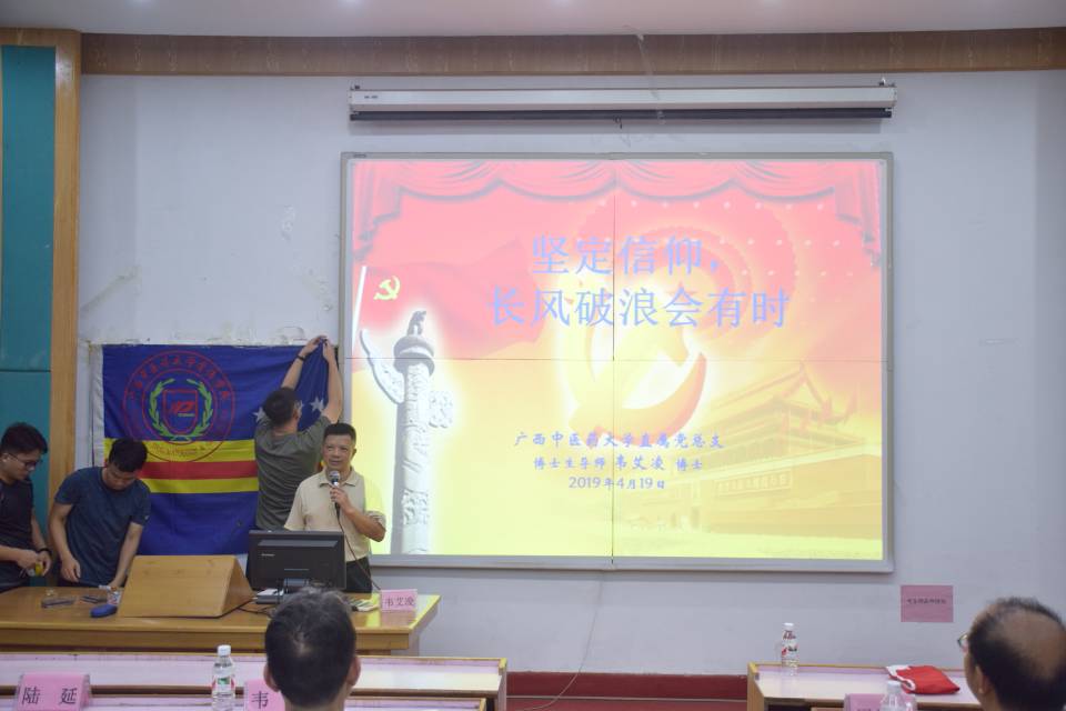 2019 年 5 月 19 日 19 : 30 ,直属党总支韦艾凌书记于Beat365中国唯一官方网站明秀校区西梯一教室为骨伤学院全体师生上了一场精彩的 主 题党课。本次党课到场的有骨伤学院院长周红海 教授 、 副院长周学龙教授、韦明老师、温健老师、刘渊老师、陆延老师 以及 2015 级中医骨伤班全体成员和 2016 级中医骨伤班全体成员。