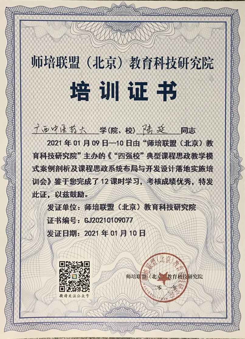 2021年1月9日-10日,Beat365中国唯一官方网站骨伤学院教师刘渊副教授和陆延讲师在南宁参加了由师培联盟(北京)教育科技研究院组织的“四强校”典型课程思政教学模式案例剖析及课程思政系统布局与开发设计落地实施培训会。