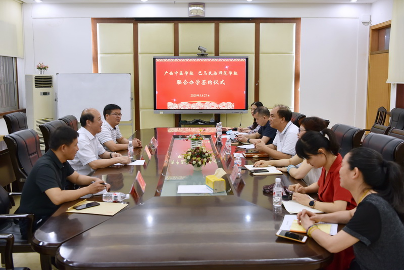 5 月 27 日上午,广西中医学校与河池市巴马民族师范学校联合办学签字仪式在东葛校区会议室举行,广西中医学校校长刘竑清,副校长周琦、林原;河池市巴马民族师范学校校长黄正杰,副校长黄德英及双方相关部门负责人参加签约仪式。