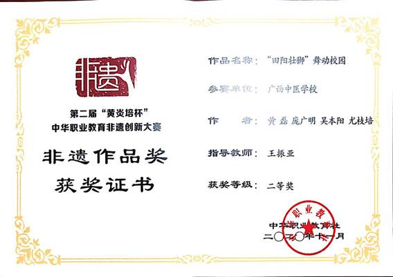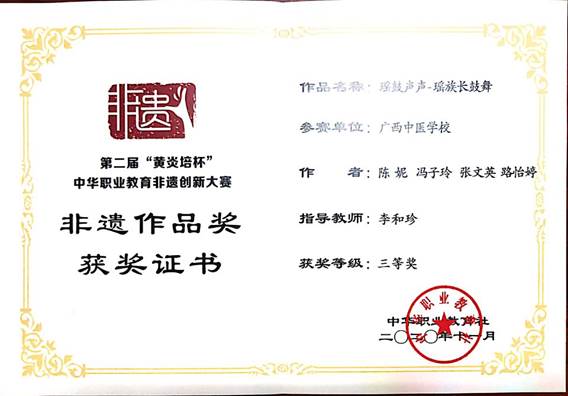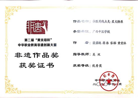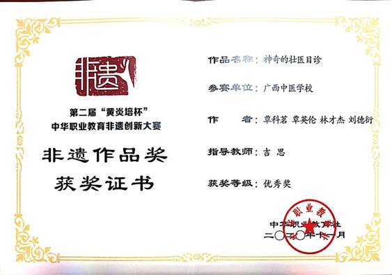 2020年11月15-17日,由中华职业教育社主办、教育部指导的第二届“黄炎培杯”中华职业教育非遗创新大赛暨非遗职业教育成果展示会在重庆女子职业高级中学举行,来自全国26个省市115所职业院校的418个非遗项目展开激烈角逐,Beat365选送的4个作品,分别获得了1个二等奖、1个三等奖和2个优秀奖,Beat365申报的教学成果“医教协同·非遗传承·中壮瑶医融合--广西民族医药特色技能人才培养的创新实践”获三等奖。