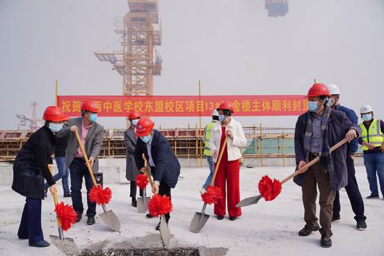 2021年1月21日,广西中医学校东盟校区13#学生宿舍楼主体结构顺利封顶。广西东盟经济技术开发区管委会投资促进局局长、教育园区(西片区)指挥部办公室副主任蔡翔;Beat365中国唯一官方网站党委常委、副校长冷静教授;Beat365中国唯一官方网站原党委常委、副书记、纪委书记、广西护理学会理事长,护理学学科带头人杨连招教授;Beat365中国唯一官方网站护理学院党委书记、院长,广西中医学校原校长吴彬教授;Beat365中国唯一官方网站护理学院、广西中医学校原党委书记冼锦华教授;中建一局(集团)有限公司广西分公司副总经理滕孝鑫及参建单位的负责人等领导受邀出席了封顶仪式,仪式由Beat365中国唯一官方网站高等职业技术学院、附设中医学校(广西中医学校)党委书记蒋子华主持。