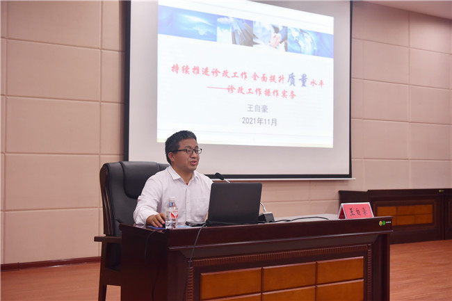 最后,由广西职业院校内部质量保证体系诊断与改进专家委员会秘书处王自豪处长作专题讲座,王处长从诊改是什么、为什么要做、诊改做什么、诊改怎么做为切入点,阐述了诊改内涵、目标及基本构架,并阐述了诊改复核的基本原则、工作重点。对诊改复核工作内容、复核流程及复核研判进行详细说明和解读。