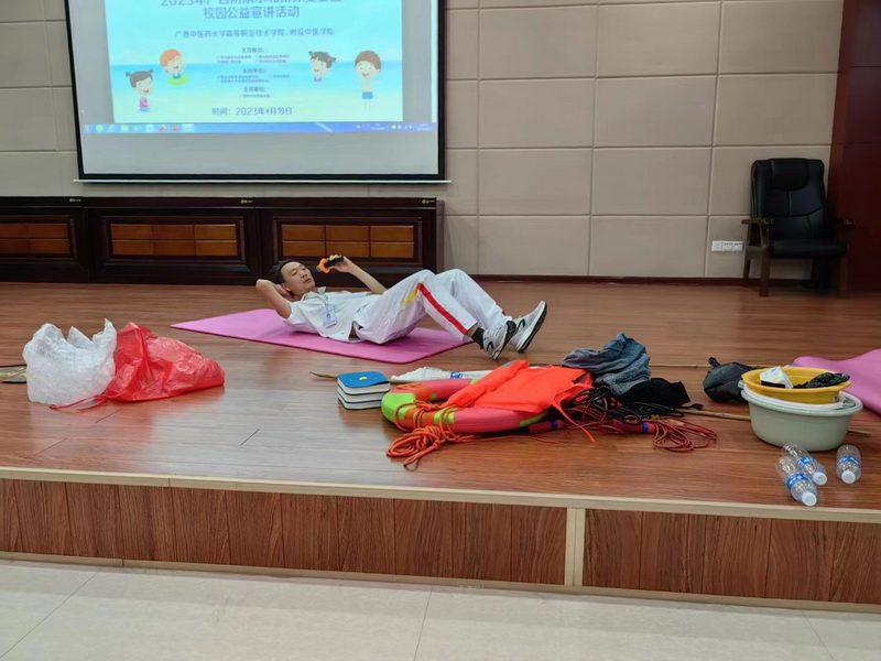 在此次安全教育讲座中,陆会长结合学生年龄、专业等特点,向学生们介绍了预防溺水常识和溺水救护方法等安全知识,引导学生时刻牢记防溺水安全“六不”要求,进一步提高“安全第一,生命至上”意识,“防”字当头,远离危险。陆文刚会长结合近几年溺水意外事件的真实案例来分析事故所造成的原因,呼吁所有学生不要私自下河游泳,注意生命安全。陆会长还用我们身边随处可见的工具向我们演示了出现溺水意外时如何利用手边的工具进行救援,同学们争先恐后的上台体验,并用已有的医学生急救知识展示救人技能。