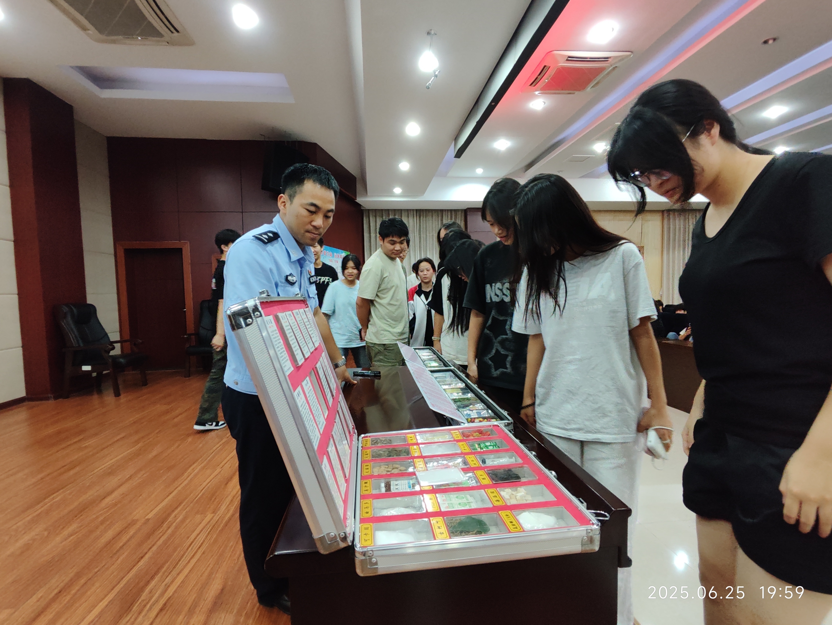 在讲座环节,李天佑凭借丰富的经验,结合真实案例,深入浅出地讲解毒品种类分类,毒瘾产生原理,毒品对国家、社会、家庭及个人严重危害,吸毒所需要承担的法律后果以及青少年如何有效预防毒品等知识,引发在场师生强烈共鸣。活动现场警官们还向同学们展示常见仿真毒品模型,手把手教同学们如何识别新型毒品,同学们踊跃上前观摩咨询。