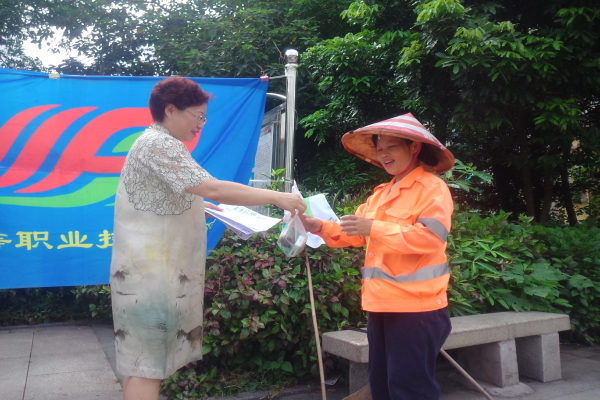 高职院党总支副书记、副院长周琦给环卫工人派送解暑药品