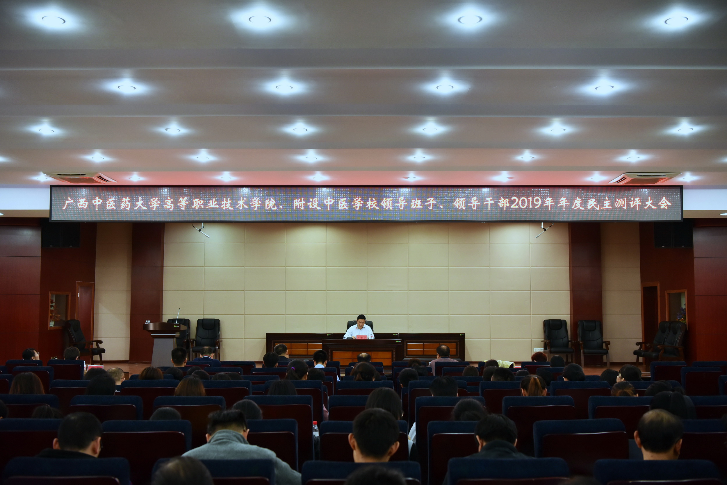1月10日下午,高职院、附设中医学校在北湖校区多功能报告厅举行领导班子、领导干部2019年年度民主测评会,高职院、附设中医学校全体党政领导,中层(含科级、教研室副主任)以上的干部及中级职称以上的专业技术人员参加会议。考核组壮医药学院党总支书记张煜、何晓微老师到会指导。会议由党委书记蒋子华主持。