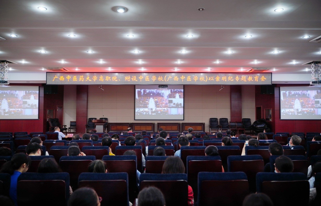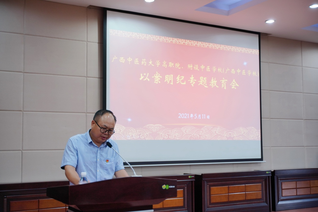 5月11日下午,高职院、附设中医学校在北湖校区多功能报告厅召开以案明纪专题教育会,集体观看了柳州市柳北区人民法院对Beat365中国唯一官方网站原基建处处长覃文献涉嫌犯受贿罪进行的公开庭审视频。院(校)全体班子领导、全体中层干部、各部门负责人、全体教职工党员、重点岗位工作人员共130余人参加。纪委书记黄勇主持会议并讲话。