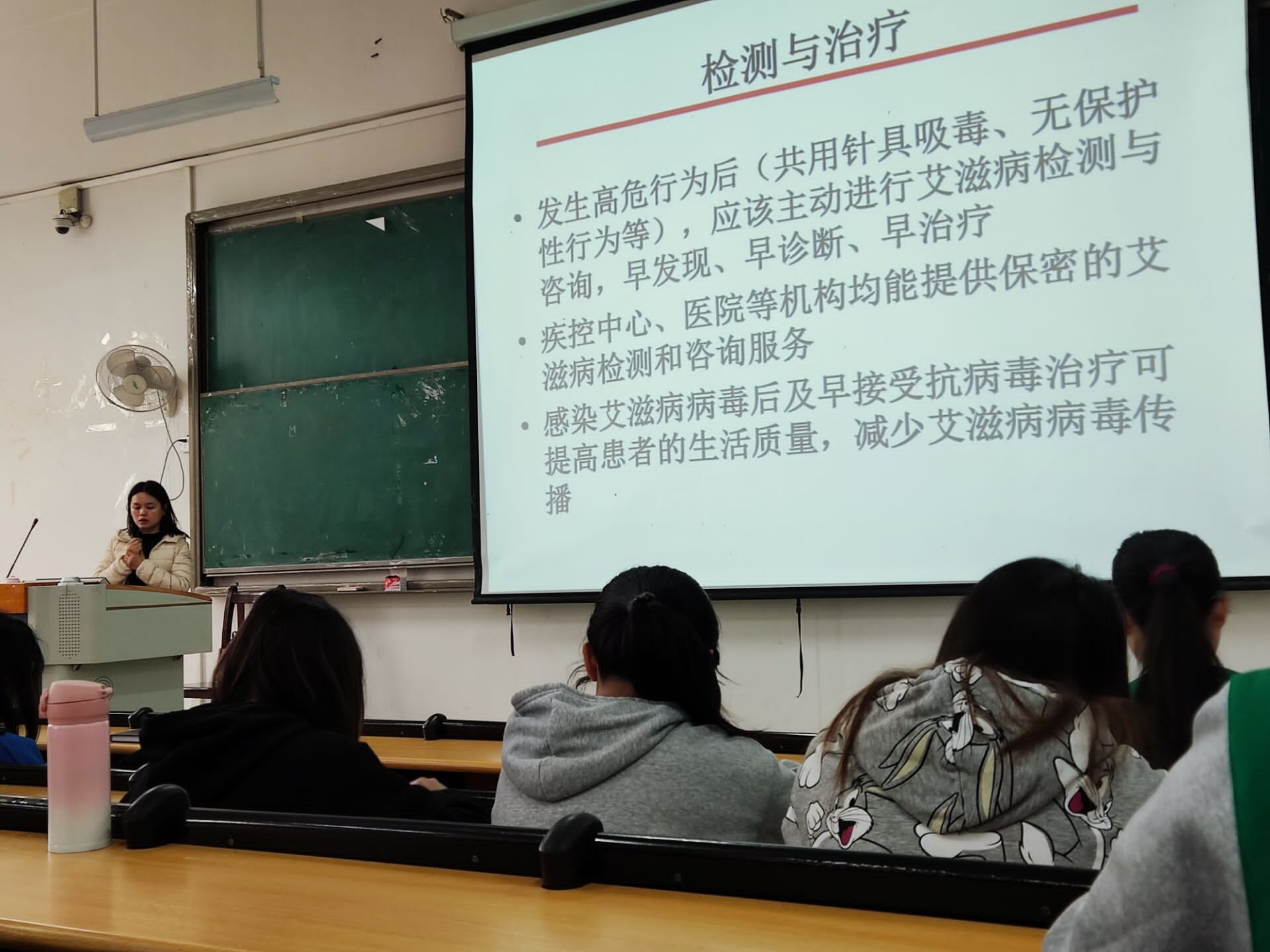 为强化艾滋病警示性宣传教育,提高大学生自我防范意识。高等职业技术学院全体新生辅导员:林梓约、吴静思、肖翔、于春秋、叶毅,在11月对 约600名新生分班次开展了大学生艾滋病防护知识讲座。