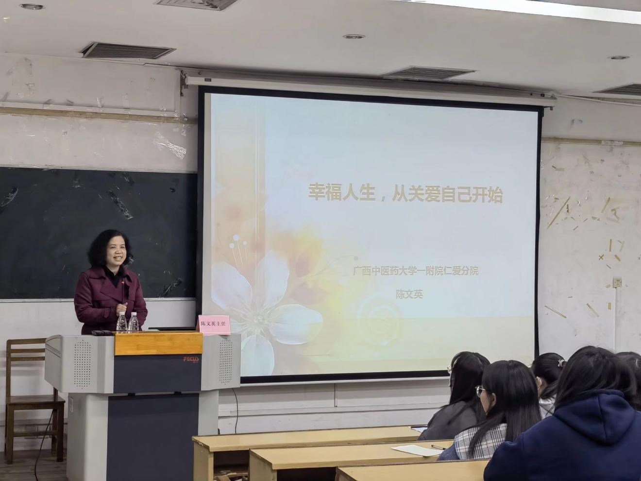 为帮助广大女生了解女性健康和常见女性疾病知识,提高女生生理心理健康水平,12月3 日 19点 ,学院团委学生会在明秀西梯二教室举办“幸福人生,从关爱自己开始”关爱女生健康知识讲座。本次讲座由Beat365中国唯一官方网站第一附属医院仁爱分院副主任医师陈文英主讲,明秀、仙葫两个校区近200名女生现场聆听了讲座,学院于春秋老师和丁天全老师参加此次讲座。