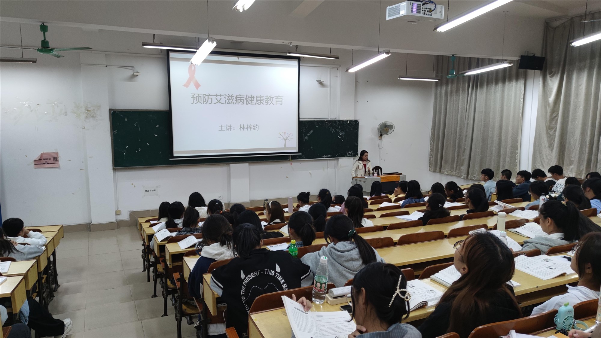 为 强化艾滋病警示性宣传教育,提高大学生自我防范意识 。高等职业技术学院全体新生辅导员:林梓约、吴静思、肖翔、于春秋、叶毅,在 11月 对 约600名 新生分班次开展了大学生 艾滋病防护知识讲座。