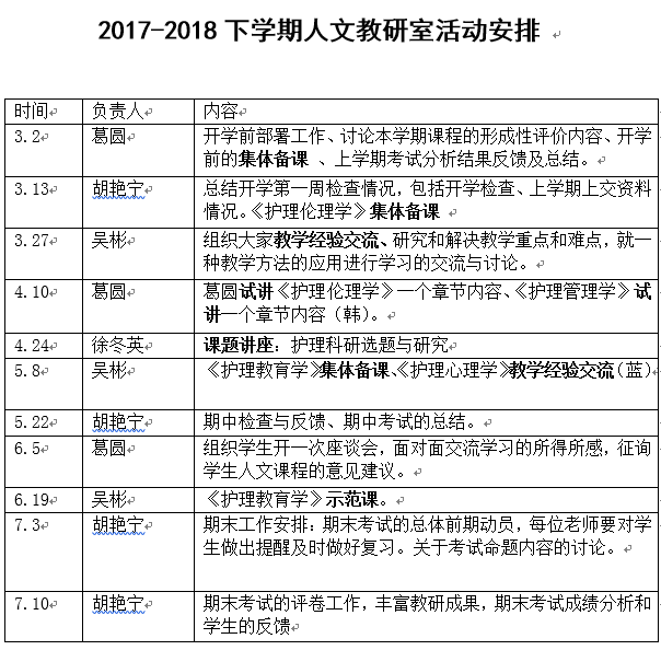 护理人文教研室2017-2018下学期工作计划