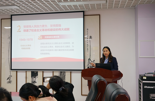 韩叶芬以“百年奋斗谋复兴 勇毅前行兴伟业”为主题,从中国共产党百年奋斗历程、新时代的历史性成就及变革、历史意义及积累的历史经验四个章节展开,深入浅出的阐释了新时代变革性实践、突破性进展及标志性成果。让党员同志充分认识到,中国共产党深刻地、历史性地推动中华民族发展进程,从根本上改变了中国人民的前途与命运。引导大家深入思考中国共产党为什么能、马克思主义为什么行的历史逻辑、理论逻辑和时间逻辑。坚定同志们对党的全面领导的信任、对中国特色社会主义的信念、对全面建设社会主义现代化国家和实现中华民族伟大复兴的信心,厚植爱党爱国爱社会主义的情感,奋进新征程、建功新时代。
