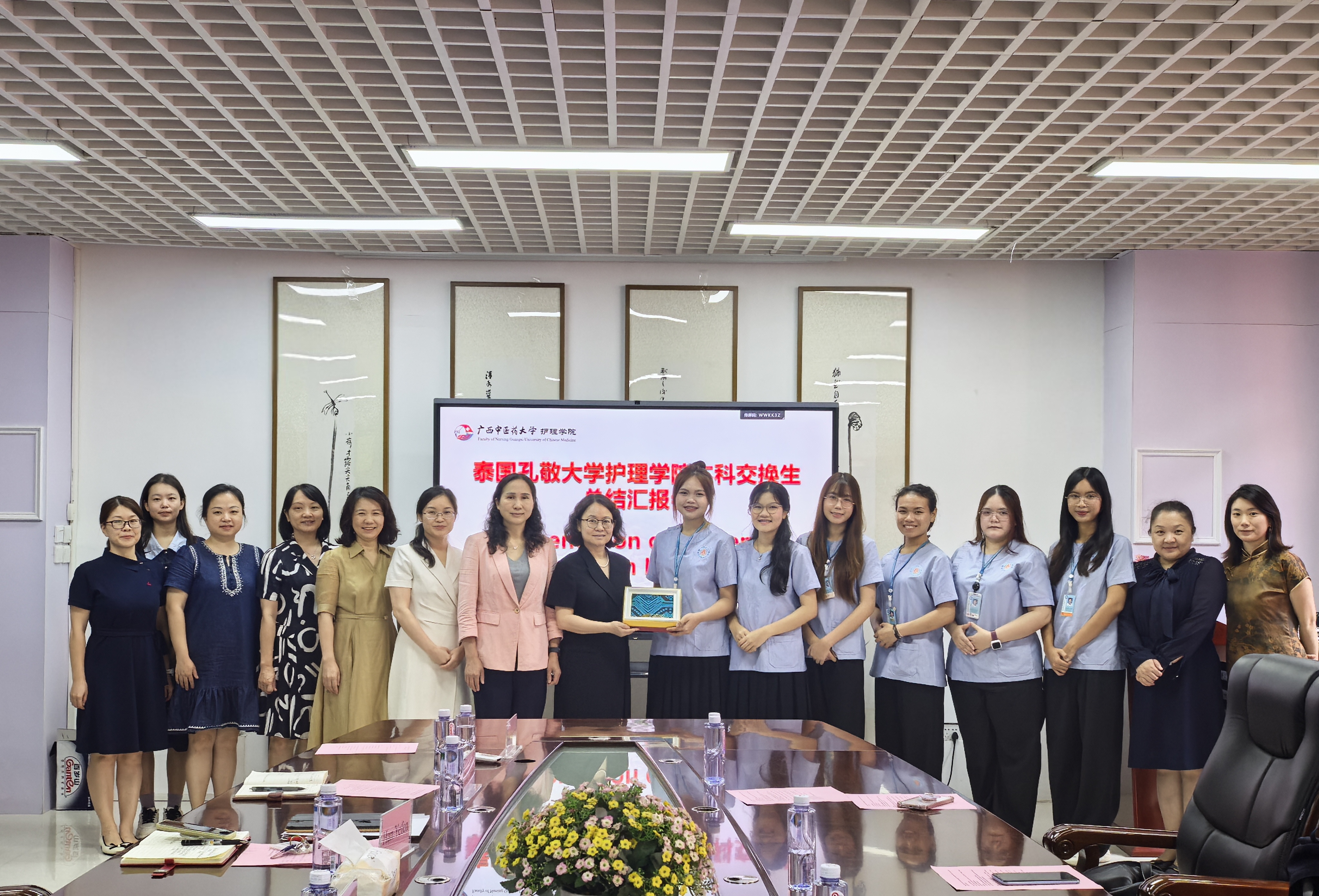会上,韩叶芬全面总结了泰国交换生在校学习与生活情况,高度肯定了交换生们积极的学习态度和在跨文化交流中展现的专业素养。在成果汇报环节,泰国交换生结合自身学习体悟,详细阐述了对阴阳五行、藏象学说、体质辨识等中医核心理论的独到理解,并通过临床案例生动展示了在附属医院掌握的艾灸、拔罐、刮痧及葫芦灸等民族特色护理技术,规范的操作获得带教教师一致认可。同时,泰国交换生还沉浸式参与了中医食疗工坊、传统药锤制作等特色实践活动,将中医“治未病”理念与护理技能深度融合。此外,还分享了在中国体验到端午节文化 、壮族壮锦、五色糯米饭等中国传统文化。交换生们以收获满满的喜悦表达对学校的感谢。