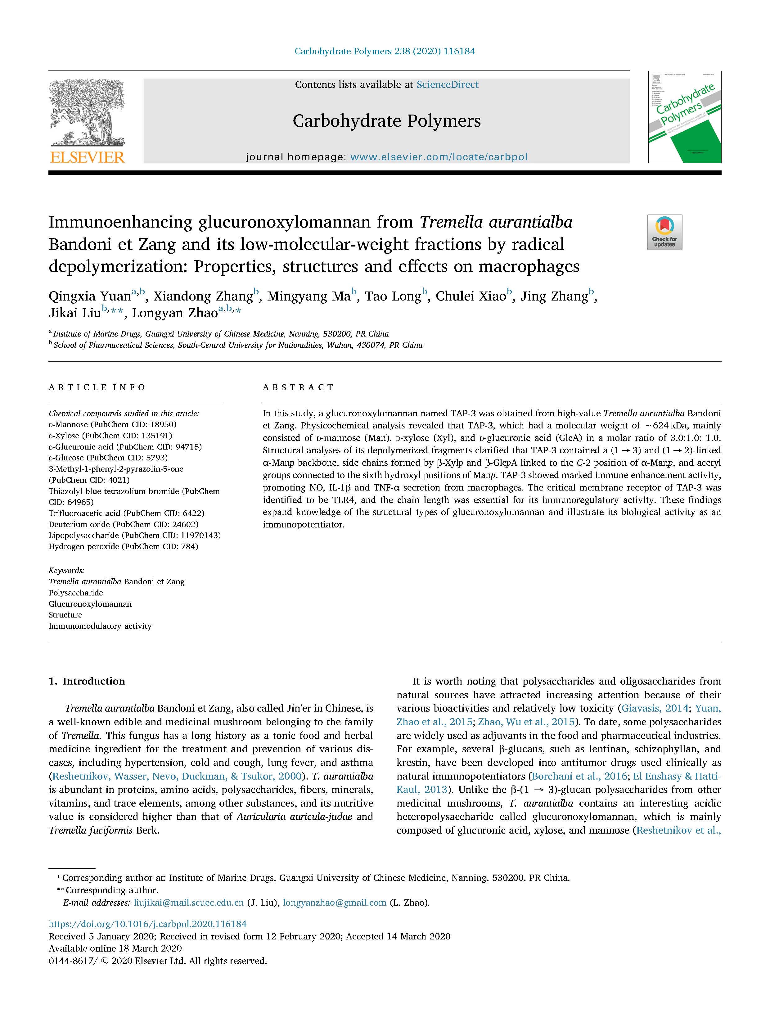 2020-Immunoenhancing glucuronoxylomannan from Tremella aurantialba Bandoni et Zang and its low-molecular-weight fractions 发布时间:2020-10-21 15:24:10 浏览次数: 次 【字体:小 大】 分享到: 【打印正文】