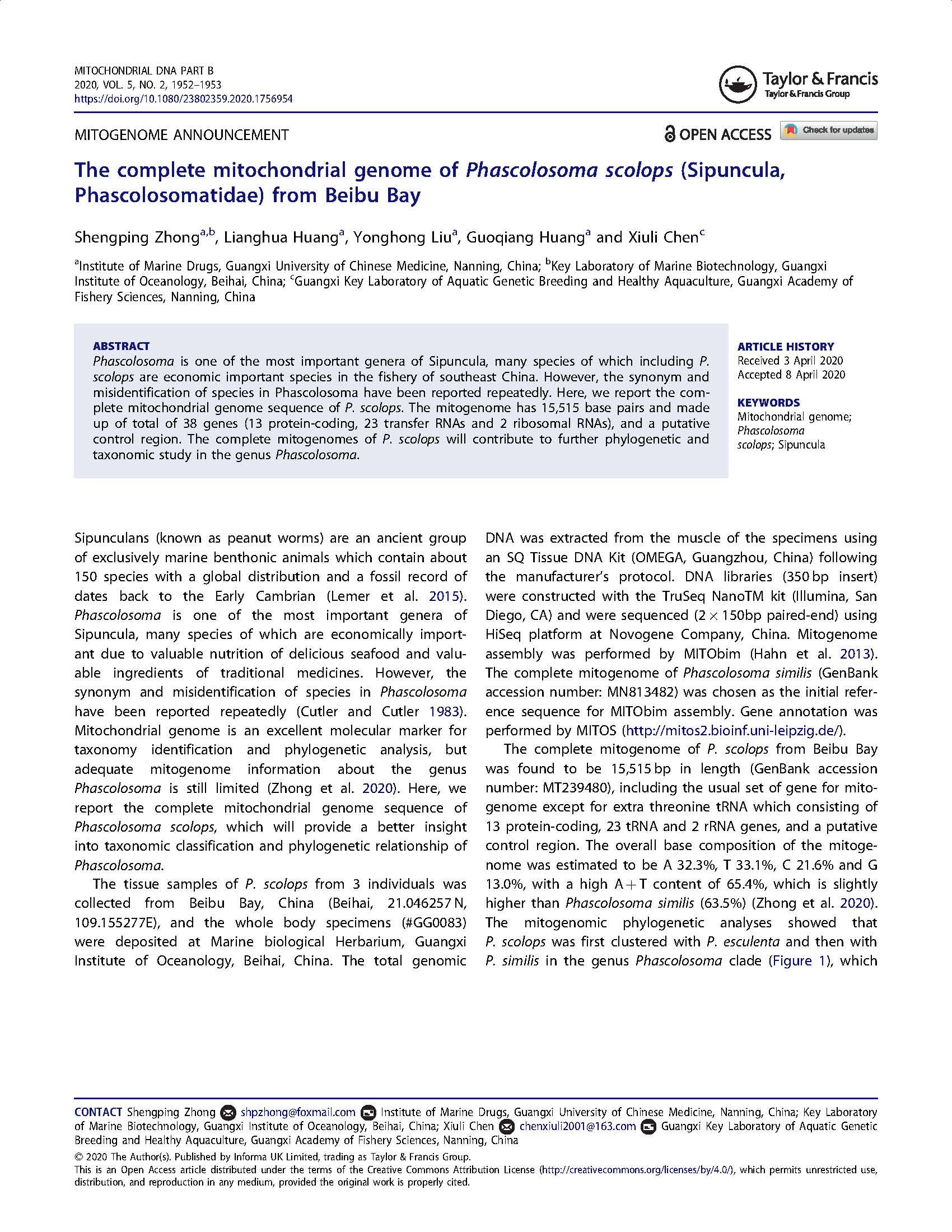 2020-The complete mitochondrial genome of Phascolosoma scolops Sipuncula Phascolosomatidae from Beibu Bay 发布时间:2020-10-21 15:59:40 浏览次数: 次 【字体:小 大】 分享到: 【打印正文】