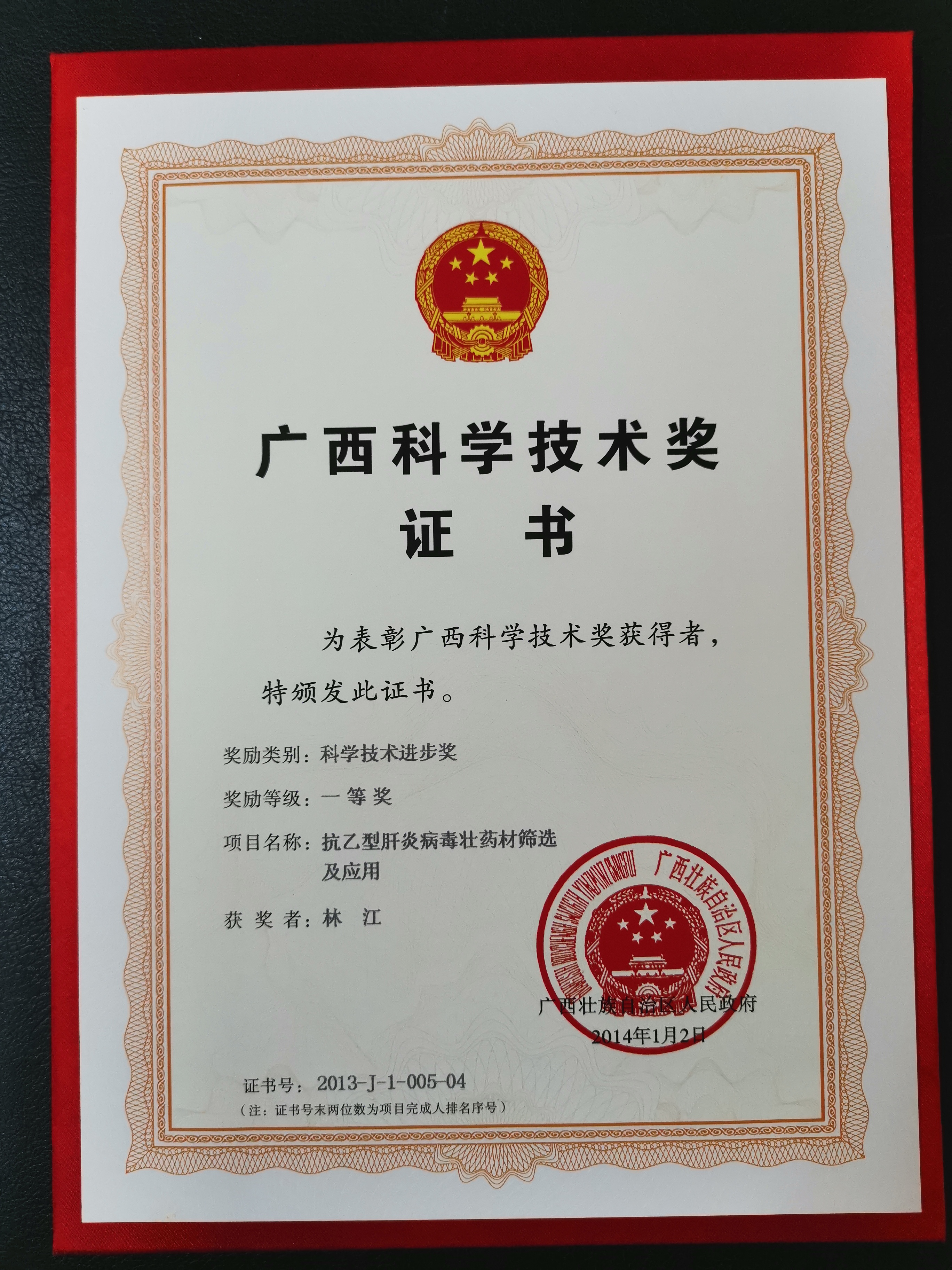 广西科技进步一等奖(林江教授,2013年)