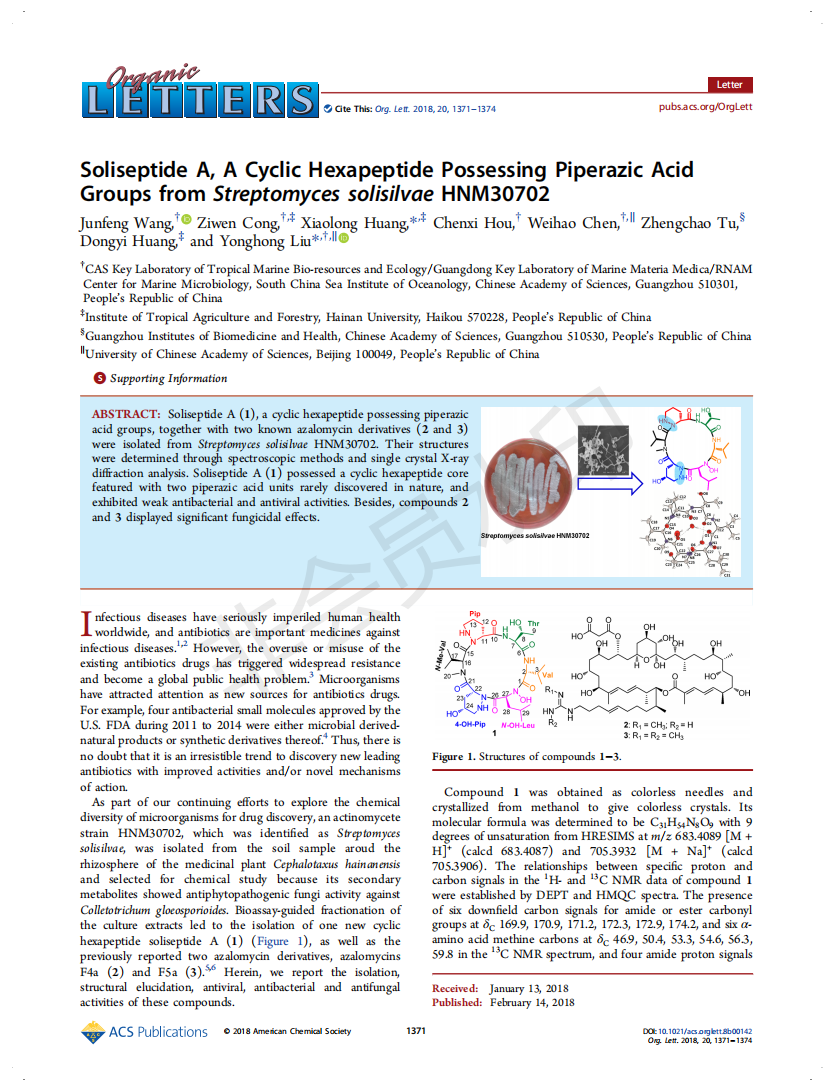 Soliseptide A, A Cyclic Hexapeptide Possessing Piperazic Acid Groups from Streptomyces solisilvae HNM30702 发布时间:2019-07-18 21:29:04 浏览次数: 次 【字体:小 大】 分享到: 【打印正文】
