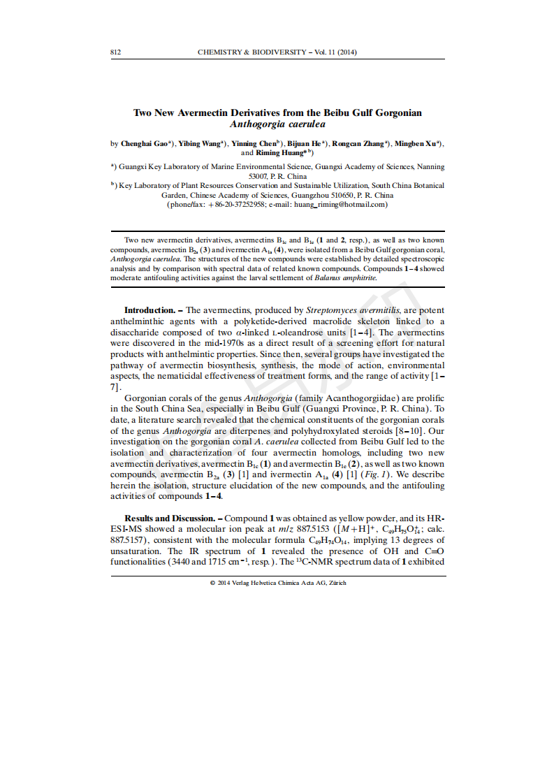 2014-Two New Avermectin Derivatives from the Beibu Gulf Gorgonian 发布时间:2019-07-16 15:27:50 浏览次数: 次 【字体:小 大】 分享到: 【打印正文】