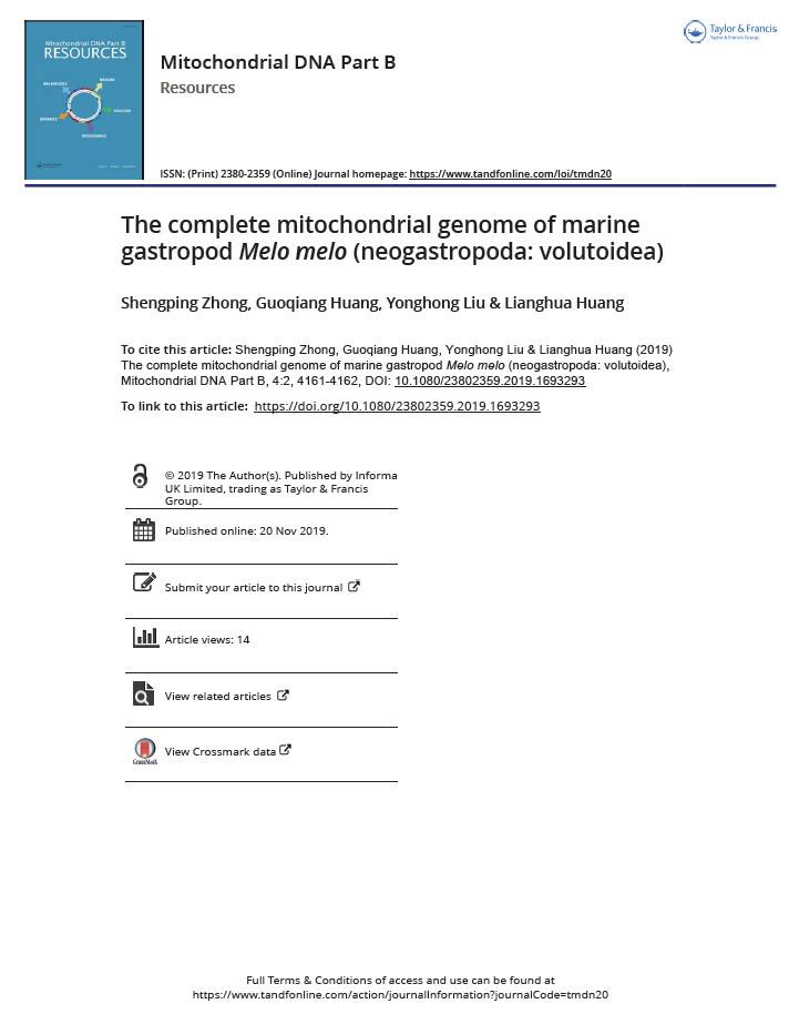 2019-The complete mitochondrial genome of marine gastropod Melo melo (neogastropoda :volutoidea) 发布时间:2020-10-20 15:09:59 浏览次数: 次 【字体:小 大】 分享到: 【打印正文】