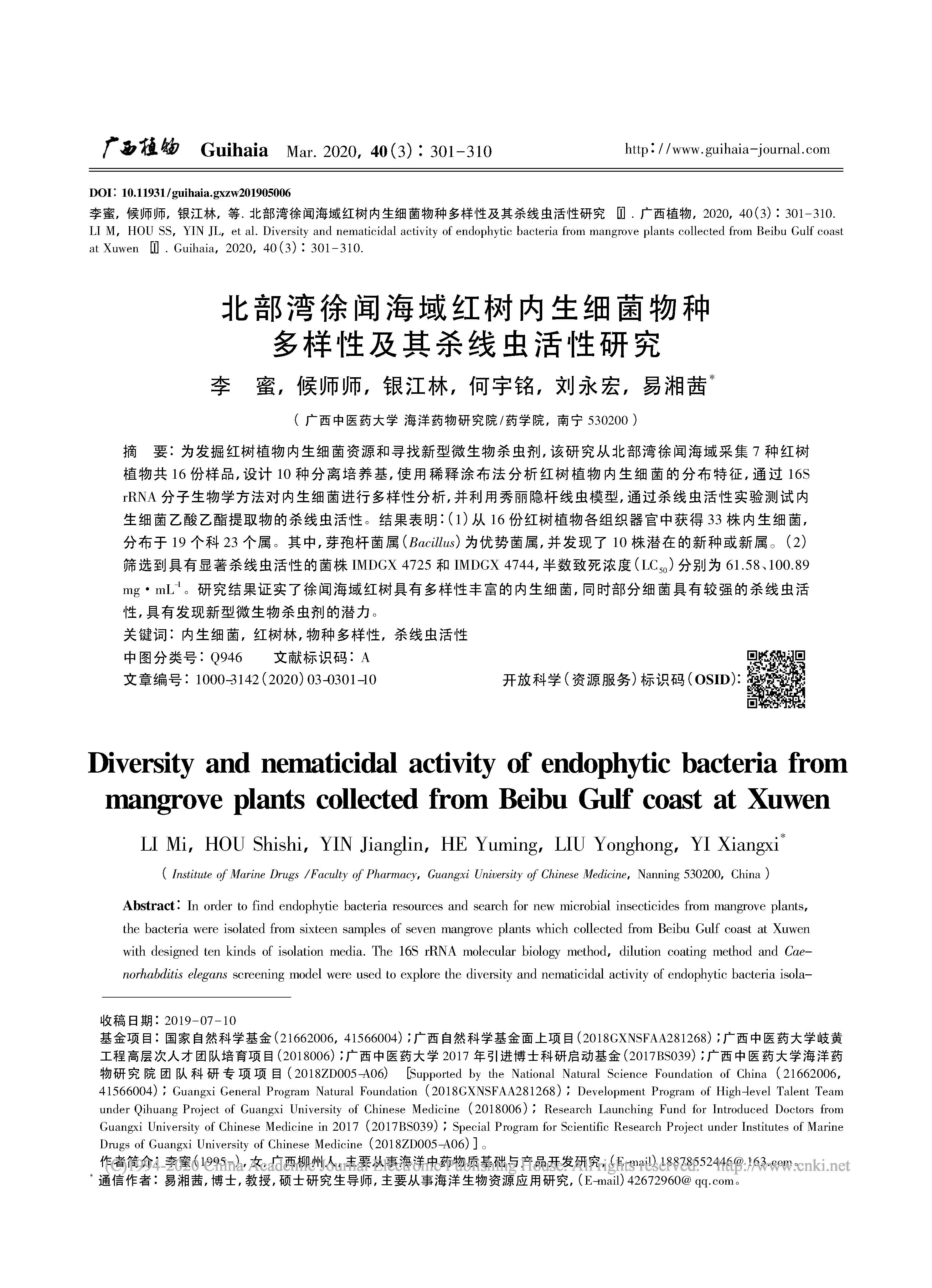 2020-北部湾徐闻海域红树内生细菌物种多样性及其杀线虫活性研究